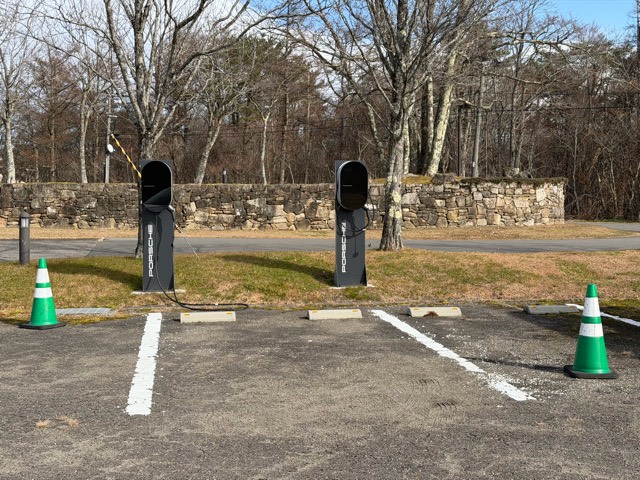 緑のコーンが置いてあるので充電しない車は止められないようになっています。施設利用者のみ利用可能です。クラブハウス建物の手前、左手にあります。写真ほどではありませんが夜は照明もあるので宿泊の時も便利そうです。