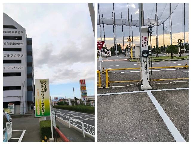使用レポート! ぐんまフォークリフトセンターの看板を目印に、駐車場へ入ると正面にあります。パイロンが置いてあり、充電スペースが確保されていました。
