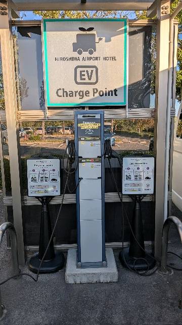 場所は立体駐車場の1Fに3口の設置です。 ただし入り口は予約制の立駐入口の方ではないです。 写真の平面駐車場の「広島空港駐車場」から入って、立駐の1Fに行きます。