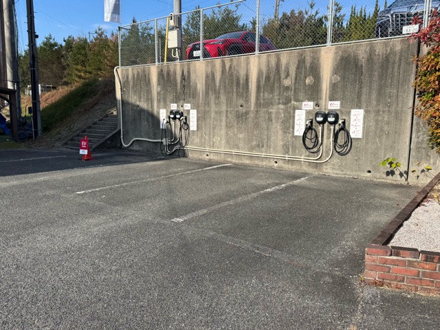 お店を抜けて、裏にある駐車場の右奥にあります。 充電器の場所を聞いて充電できました、蜘蛛の巣がありましたので、もっと使って有意義な充電器になって欲しいです。