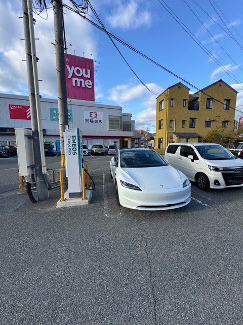 入り口を入ってすぐ左手にエネオスの50kW機が1台あります。 入り口付近で車の出入りが激しくて忙しい印象です。