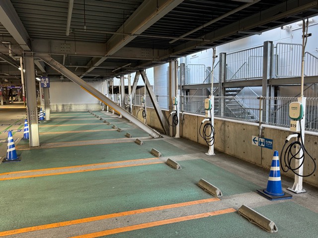 立体駐車場の3階にエネオスチャージプラスの6kWが6口、 4階に9口あります。 ケーブルの長さが十分にあるので、3階でもテスラが充電できるようになりました。