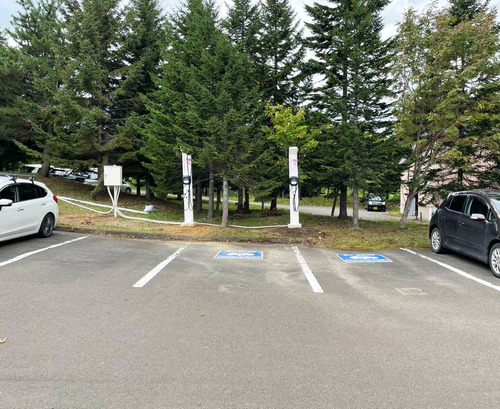 設置場所:施設入口へ入り、道なりに進みます。建物前を通過した先、樹木沿いの駐車スペースにEV充電器があります。 どなたでもご利用いただけます。 最大出力6kW