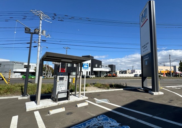 中古車展示場側の駐車場の片隅に1台分の充電スポットがあります。多くの場合、一般車が駐車していますが、言えば開けてもらえます。