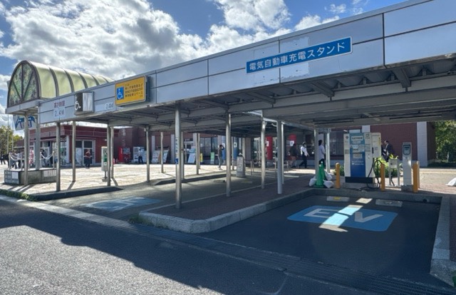 駐車場の奥側、トイレ前にあります。 40kWなのは少し残念。 2025年度に新しい充電器に変わる計画とのこと。