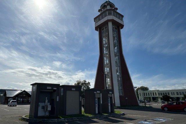 ニチコン製20kW器×2器(右側2器)と平河ヒューテック(株)製3kW×2器(左側2器)です。普通充電器の右側器は引き続き故障中なのでしょうか?張り紙など無くシャッターもロックされてました。道の駅敷地入りすぐ目の前、鐘の塔下に設置されてます。