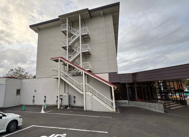 ENECHANGE認証Zerovo Technologies製6kW×4器です。ホテルエントランス裏手、建物壁に設置されてます。充電時はホテルフロントへお声掛けくださいと掲示されてました。