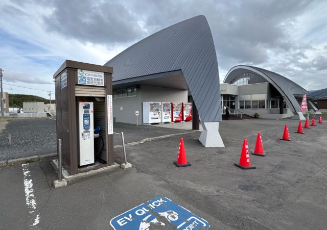 ニチコン製20kW器です。富良野方面から敷地入りすぐ目の前に設置されてます(道の駅棟とトイレ棟の間)。経路充電としてはそろそろ高出力器への更新お願いしたいです。