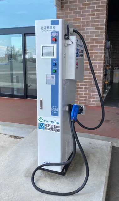 ニチコン製25kW器です。道の駅建物目の前に設置されてます。屋根付きなので悪天候時濡れずに充電出来ます。