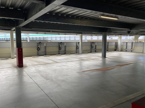 EV用充電設備は、立体駐車場2Fに設置されています。 2Fへ上るスロープを上って180度右Uターンするとすぐ右側に充電設備が有るので、後続車が有る時はスロープを上っている時からハザードランプを点灯させるなど後続車から追突されないように注意した方が良いと思います。