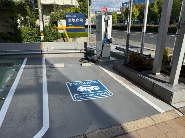 設置場所:施設立体駐車場裏の屋外駐車スペース左側の車室にEV充電器があります。 どなたでもご利用いただけます。 最大出力6kW
