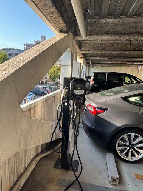 設置場所:立体駐車場2階、屋外に出る直前にEV充電器があります。 どなたでもご利用いただけます。 最大出力6kW