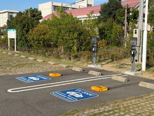 EV用普通充電設備は、敷地南側の同炉から敷地に入ってすぐ右側の1台目と2台目の駐車スペースの間に設置されています。