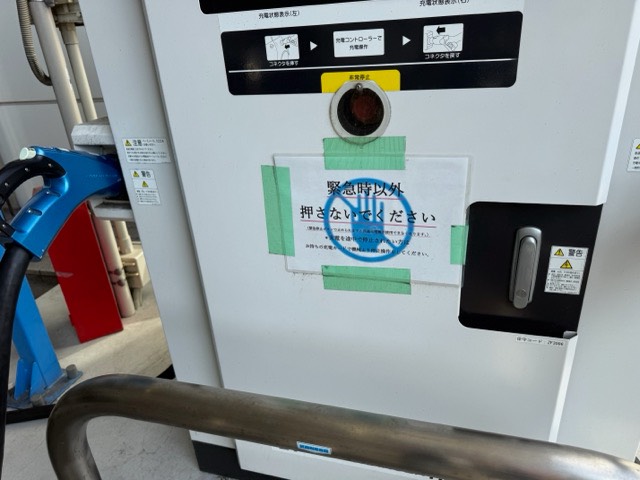 「緊急時以外押さないでください」という張り紙がありました。 テスラの充電器って何もないから間違いも起きにくい、シンプルなのが1番だと思います。 アンテナにケーブルをかけて壊すという事例もありますね、どこかでアンテナがもげているのを見たことがあります。 充電のシンプルさは普及に大事だと思います。 張り紙の必要ない充電体験が早く訪れてほしいですね。