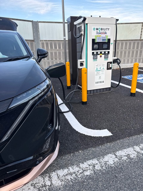 施設建物の奥にある駐車エリアの左側になります。以前と同じ場所で新しい充電器に更新されています。 90kWでも十分良いとは思うのですが、それは現時点での話。と言う気持ちもあります。 あと、更新も大事ですが、今まで充電器がなかった、SAや PAに増えていってほしい、エネチェンジのような普通充電器でもありがたいです。しっかり仮眠したい場合や、計算ミスや充電器のあるところを誤って通り過ぎたなどでも次に繋げられますし。