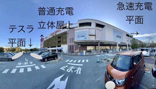 少し奥に入った店舗寄りのところにあります。 イオンモール伊丹昆陽は、急速充電の位置がトイレやマクドナルドなど、経路の中での充電で程よく、休息中だけ充電などで使っていましたが、エネオスチャージプラスの充電器が増えたことでより使い勝手が増しました。 追記: 向かって左側の充電器は、きちんと駐車すると、前に充電口があるリーフでも後ろ向き駐車で届きます。