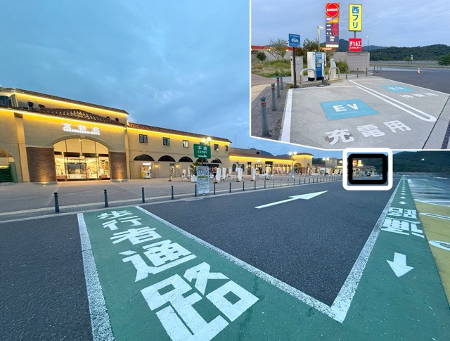 敷地に入ってすぐ左にあります。 繁盛する時間に訪れましたが、充電しない車に占有されておりました。とはいえ、お店の奥側に行くまで空きがないぐらいの混雑ぶりでしたので仕方ないのかもしれません。 ここは入ってから右と左に分かれて奥に進むのですが両方とも奥への一方通行で、戻るには一旦駐車場から出て再入場しないといけません。なので空いてたら止める確率が高くなっている感じもします。 とはいえ、奥に空いているかもしれないのに充電車室が埋まってしまうのは充電環境には良くないので、コーンの設置をお店側に要望を出しておきました。