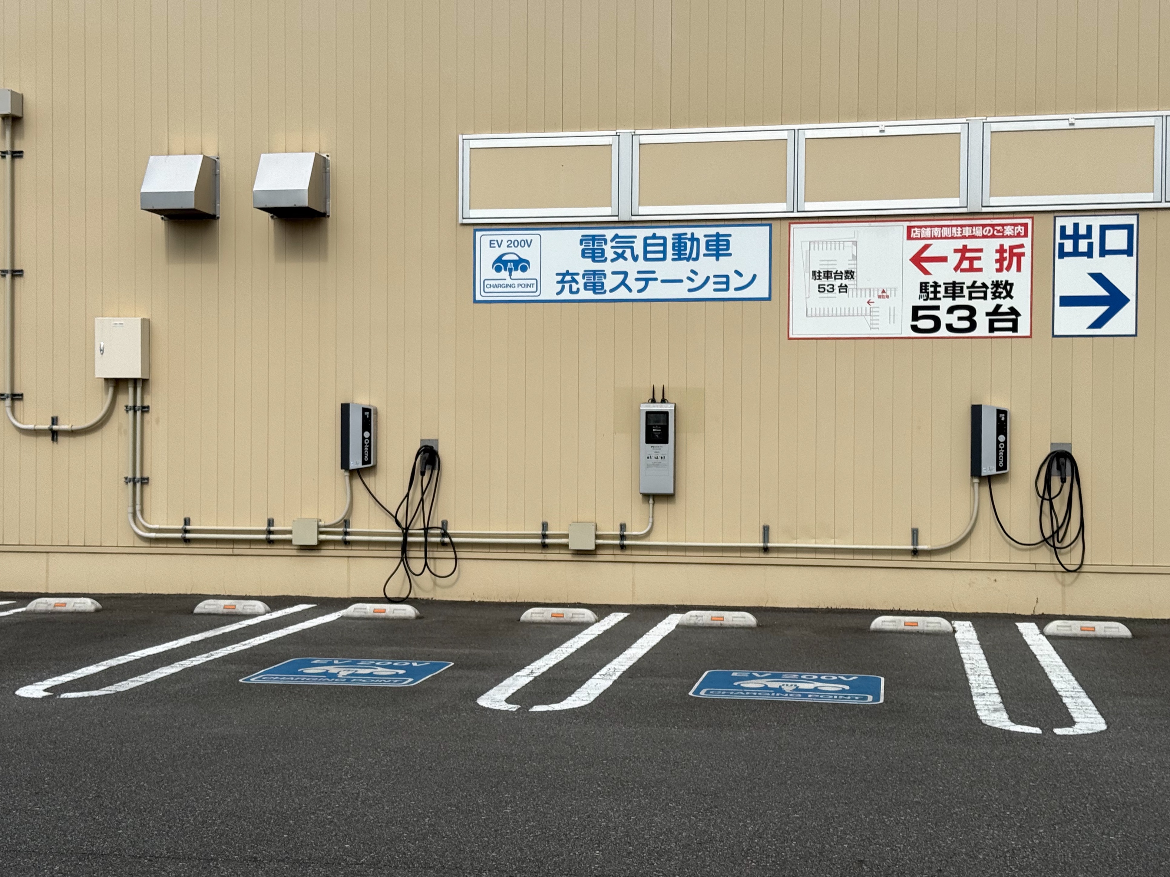 敷地に入って左にあります。 ここは今となっては30kWで出力が少し心許ないですが、屋根もあり、エコQ電で30分540円という値段設定があり、十分、選ぶ価値があると思います。 最近、いろんな三菱さんの充電器が50kWに更新されることがよくありましたので、こちらもそのうち期待したいところだと思います。
