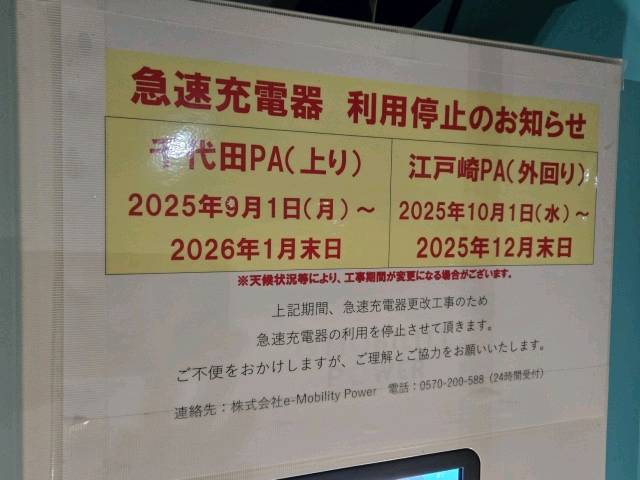 友部SAの充電器に掲示がありました。 2025年9月1日〜2026年1月末日まで充電器更新工事のため利用停止になっています。