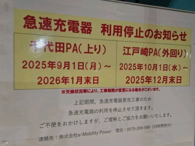 友部SAの充電器に利用停止のお知らせがありました。 2025年10月1日〜2025年12月末日まで更新工事により利用できません。