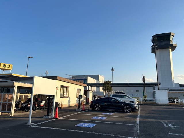 空港正面駐車場の西側(国際線側、立体駐車場手前)にあります。 充電スペースが8台分あるのでほぼ確実に充電できます。 日曜日の夕方で駐車場は混んでましたが、充電中の車は居ませんでした。 ガソリン車が1台停まってました。