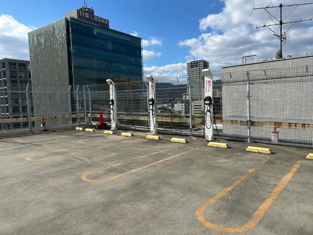 駐車料金が安くて街の中心地にあり通勤にも使われているのか、平日でも満車でした。 なので8階にたくさんある普通充電器はほとんどがガソリン車で埋め尽くされています。 急速充電器は屋上に1台のみですが、満車になりやすい駐車場で、普通車と軽自動車用各1台分のみとはいえ充電後の移動スペースが設けられているのは気が利くと思いました。