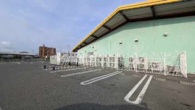 広い駐車場ですが、建物の裏側にあります。 方角的に東側にあります。