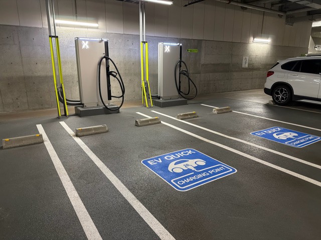 地下4階にあります。 他の方のコメントではJ区画にあると書いてありましたが、 普通充電については、LやM区画にも充電器が設置されています。 ただ、充電専用スペースでは無いので、 普通のガソリン車が充電せずに停まっていることも多々あります。