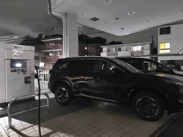 駐車場と充電器の間には段差があります。 充電器の段には試乗車が止まっているので、 充電車は下の段になります。ケーブルは短めなので、 大きめの車両で右後方、左前方に充電口がある場合、届かない場合がありそうです。