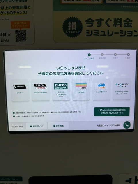 最大出力180kw急速充電器が設置されていました。(Flashですがmark.1の機械なので、チャデモコネクタのみです。)e-Mobility Power系カードなどでは使えず、クレジットカード or QRコード決済から44円/kwhで利用できます。従来課金制で充電できるのはいいですね!なお、最大出力は180kwですが、250Aなので多くのEV(400Vシステム車両)はMAX100kw程度の出力になるかと思われます。また、現時点で800Vでの充電ができる等の詳細は不明です。