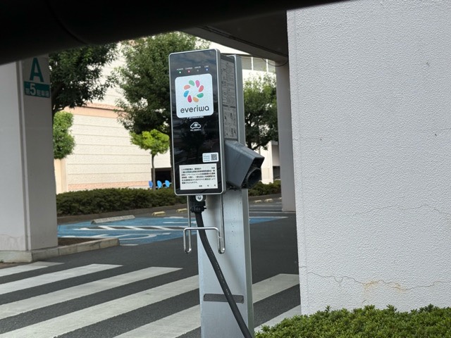 平面第5駐車場に設置されています。 ウォーク側に設置してあるエネチェンジとは異なる決済方法です。 everiwaというアプリを利用します。 利用料金は330円/1時間です。 6kW出力ですが、3kWしか対応していない車でも値段は変わらずです。 ほとんど利用している人を見かけたことないので、エネチェンジの充電器に変えた方が絶対良いと思います。 エネチェンジさん宜しくお願いします!