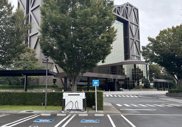 新電元工業(株)60kW充電器2口です。敷地入って左手に駐車場がありその出入口右手に設置されてます。受付棟で台帳に必要事項記入し鍵を借ります。