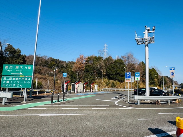 ニチコン製150kW×4器です。PAの1番奥、出口側の第2駐車場に設置されてます。充電した場合、大磯PAからは一般道へ降りられず、本線に戻るのみです。