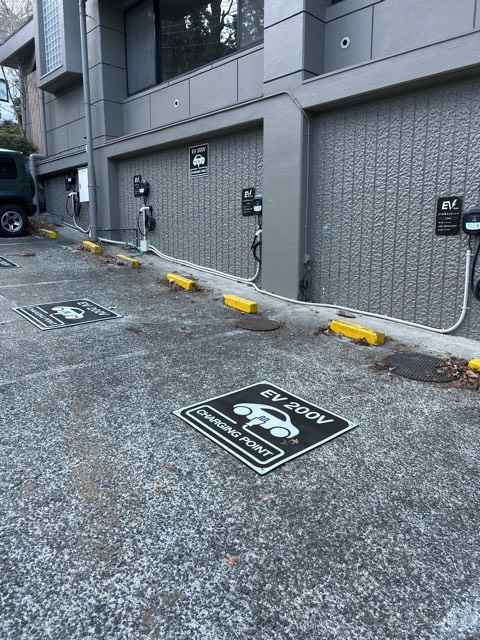 事務局にお声がけして利用できます。 200Vコンセントなのでケーブル持参です。 駐車料金無料です。 利用時間は1時間までです。 12A出てました。