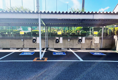 設置場所:駐車場入り口より敷地内へ入り、エントランス前を直進し、右側カーポートの車室にEV充電器があります。 どなたでもご利用いただけます。 最大出力6kW