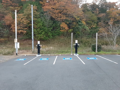 2台あるうち1台は故障中で、修理手配中みたいです。 ケーブル繋いで2台の真ん中にあるの機械を操作して、接続した充電機の番号をタッチするだけで充電開始してくれます。 この日は雪が降っておりモニタが濡れていたせいか、タッチ反応がすこぶる悪く、何度もタッチしてようやく反応してくれましたが、 タッチさえすればあとは勝手に充電してくれます。 このタイプは操作も簡単でいいですね。