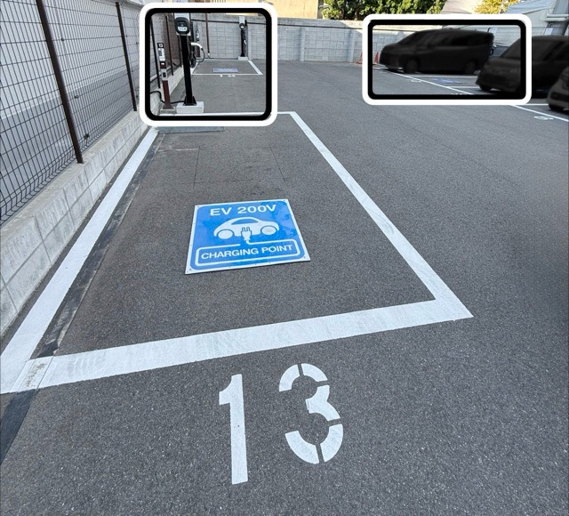 10番から13番の車室にあります。 訪れた時には11番車室が非充電車が駐車してましたが、他の充電器の無い車室は全て埋まっていました。 状況的には、「EV優先」の車室の条件は満たしていたと言うことになります。良いことだと思います。 ただ、奥の車室だから空いていたのか、EV充電器が認知されているのかは、わかりません。コーンは一つあっても良い気もします。