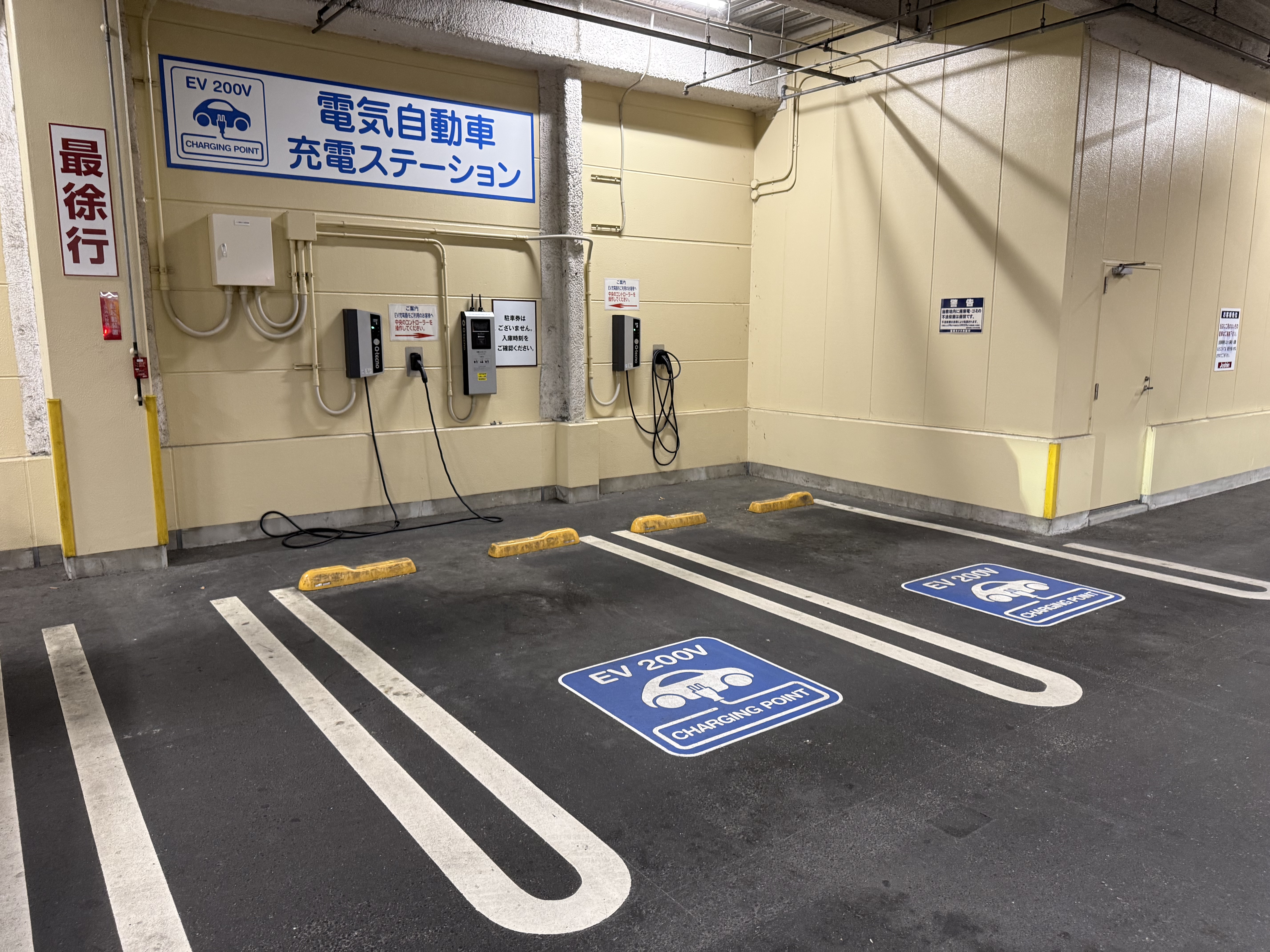 立体駐車場の3階入口で係員の方が満車なので上の階に行くように促しますが、充電器利用を伝えると3階に入れてくれました。充電器エリアはコーンが置いてありマナー良しです。普通充電ケーブルが短く車両後部左側の車は隣の駐車場のケーブル利用になりそうです。WAON使えます。