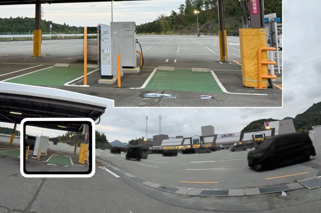 ラウンドバウトの北西にある駐車場に南の入り口のすぐ左側にあります。 ここは施設内に3口の50kWの充電器があるので、かなり安心感のある充電スポットだと思います。 (1)の方の旧式の充電器はエコQ電で1回550円なのでお安く行ける方はそちらを選ぶほうがいいかもしれません。ただ、実際の出力次第だとは思います・・ 日産サクラや、eK X EVなど30kWぐらいで充電カードを持っておられない場合などは(1)の旧充電器が残っているのは朗報かもしれません。 他の充電スポットも撤去して更新するよりも、旧式は使えるのなら残しておいて、エコQ電などでも値段を下げておいてもらえれば軽EVの多い日本ではとてもありがたいし、充電待ちの確率も下がるかと思います。