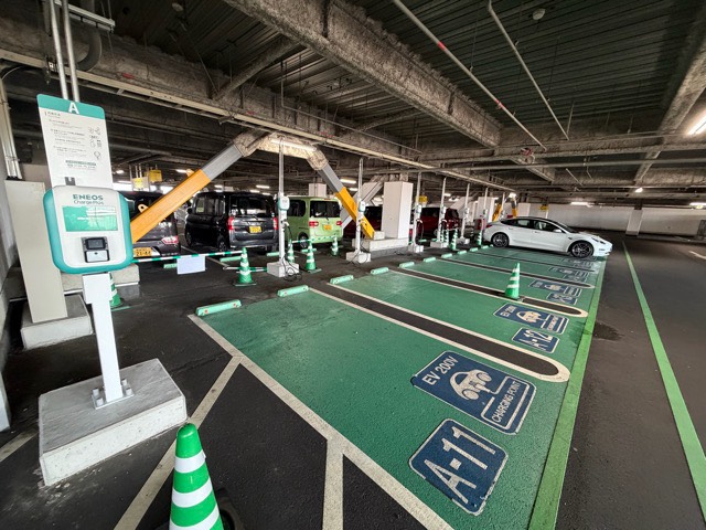 [普通充電器] 設置場所:駐車場5階Cエリア 平城エスカレーター入口付近 充電6時間まで。 ENEOS Charge Plus会員の場合、最大出力6kW
