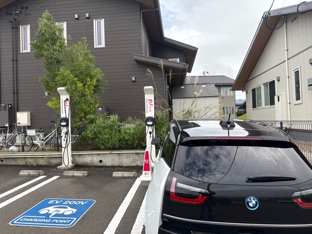 外からだと一見すると場所が分かりづらいですが 駐車場に一旦入ってくるっと回ると充電器があります