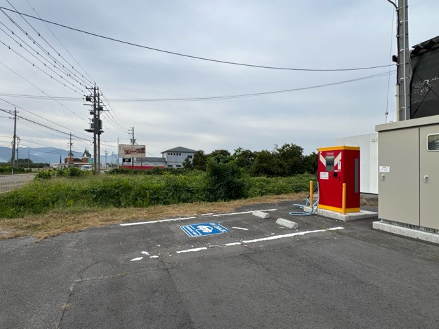 従量課金制FLASHの180kW器のCHAdeMO×1口、NACS×1口です。R18走行してても見えます。敷地入ってすぐ目の前です。