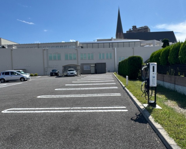 日東工業(株)製TerraChargeの6kW2口器です。アプリ登録で充電します。駐車場の一番奥に設置されてます。