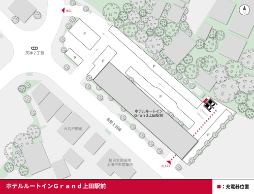 ご利用は宿泊者優先とさせていただきます。宿泊のお客様はホテルの公式サイトで詳細をご確認ください。 設置場所:国道18号(北国街道)沿いの駐車場入り口から入り、エントランス前を通過し、右側奥の建物沿いの車室にEV充電器があります。 充電器には鍵がかけられていますので、ご利用を希望される際にはフロントまでお申し付けください。 最大出力6kW