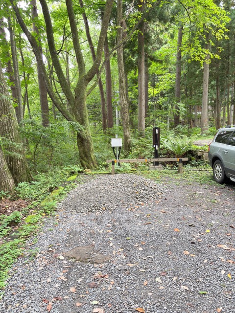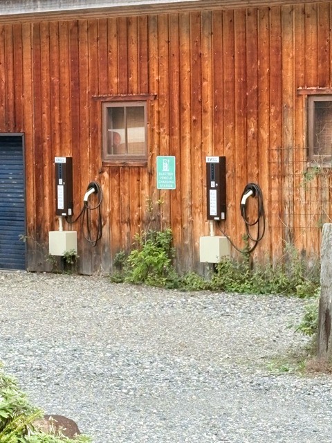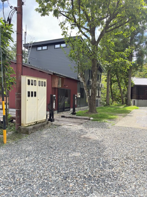 ペンション正面向かって左側の薪倉庫のようなところの前にNCSの認証付き充電器があります。 駐車場として使われているようなので、クルマが停めてあることが多いようですが、スペースは十分にあるので、届く範囲に停めて充電できます。 特に宿泊者向けでもなく、自由に24時間使えます。