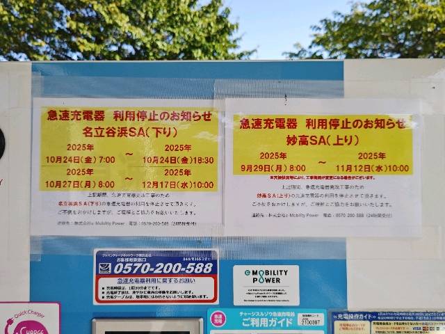 [eMPスポット休止情報] 2025/10/24 07:30~2025/10/24 19:30の間、急速充電器は設置者都合のためご利用いただけません。 2025/10/27 08:00~2025/12/19 10:00の間、急速充電器は運用上理由のためご利用いただけません。