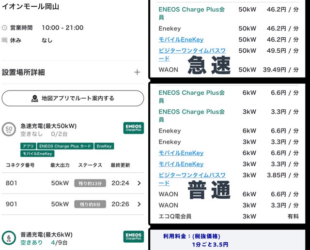 値上げ後にエネオスのアプリで京都、大阪、兵庫、岡山とイオンモールの使用状況を見ていたら、イオンモール岡山だけは使用率が高かったです。 他ので店舗は、急速も普通をかなり激減してました。平日の平均と比べての感想です。 でも完全に使われてないわけではなく、充電が快適にできそうではあります。また休日でも、充電が楽にできるようになっていると期待します。