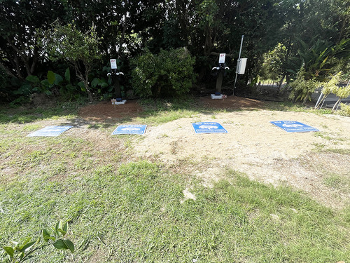 敷地の入口付近に200Vの青い看板がありますが、そこではなく、バンタカフエの駐車場内、出口付近にあります。