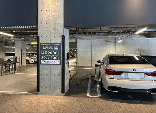 駐車場入り口すぐの右手にフェイフォン製の充電器(6kW)が2口設置されています。 利用するには宿泊後、宿泊者用のマイページから予約が可能でした。1回1,000円で利用できるとのことです。