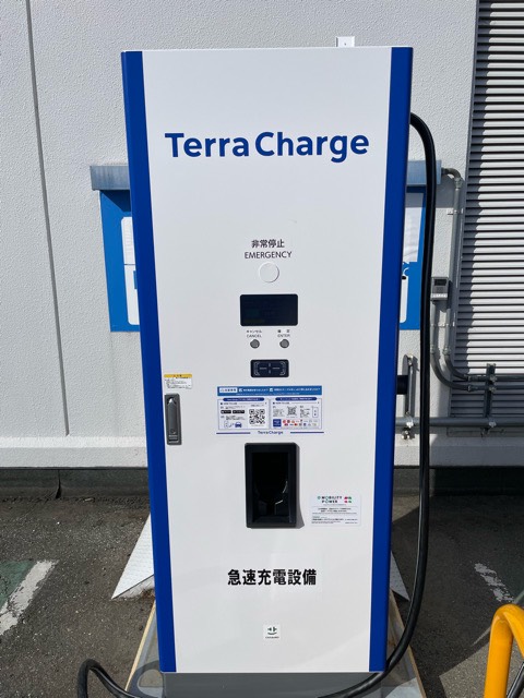 EV用CHAdeMO充電設備は、道路から敷地に入ってすぐ左側に設置されています。